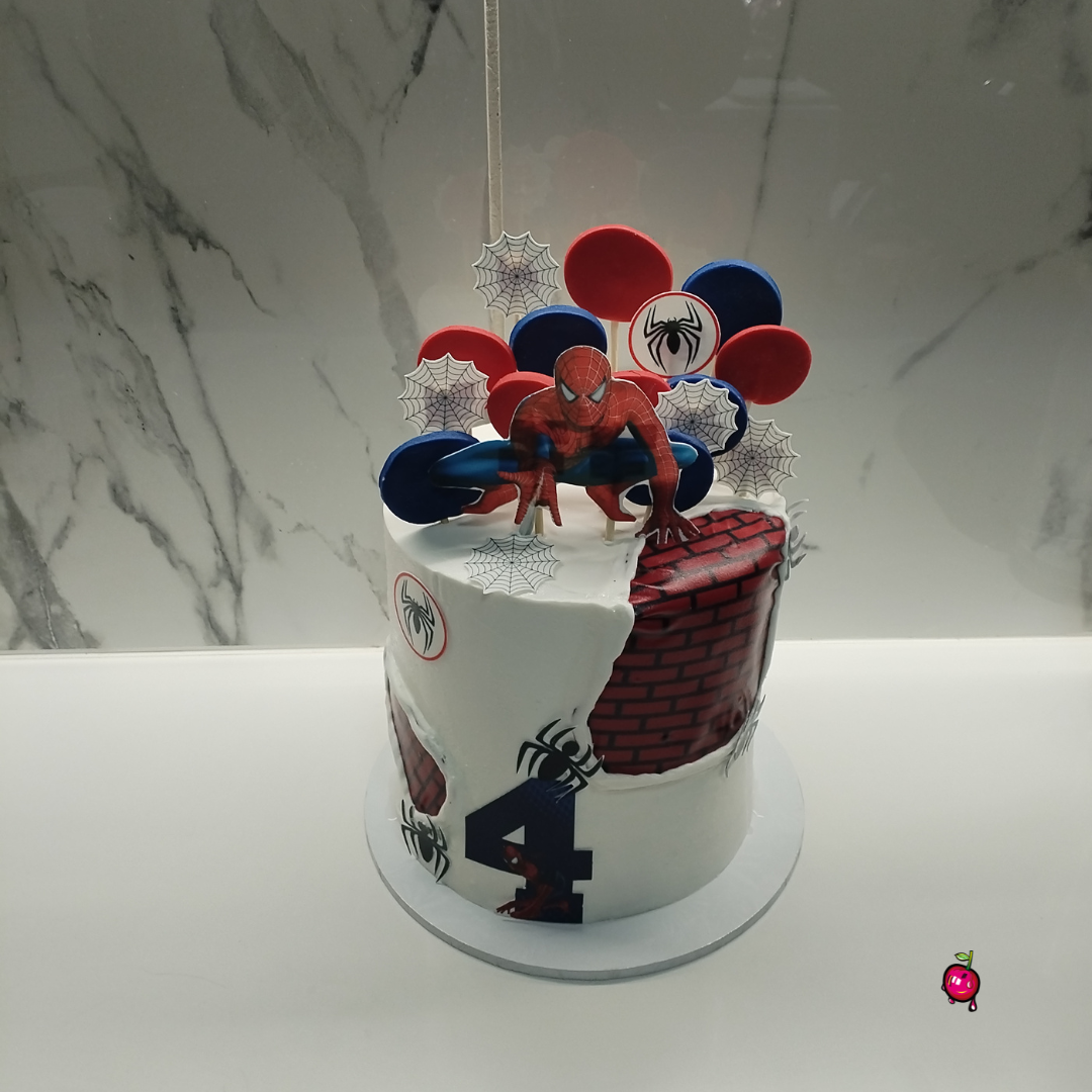This action-packed Spiderman-themed birthday cake bursts with comic book flair! Designed in vibrant reds and blues, it features Spiderman’s iconic web pattern, along with “BOOM!” and “POW!” speech bubbles in bold comic style. Edible cityscape silhouettes and Spidey’s web-slinging pose bring the adventure to life. Perfect for superhero fans, this cake is sure to make any celebration feel like an epic comic book moment!